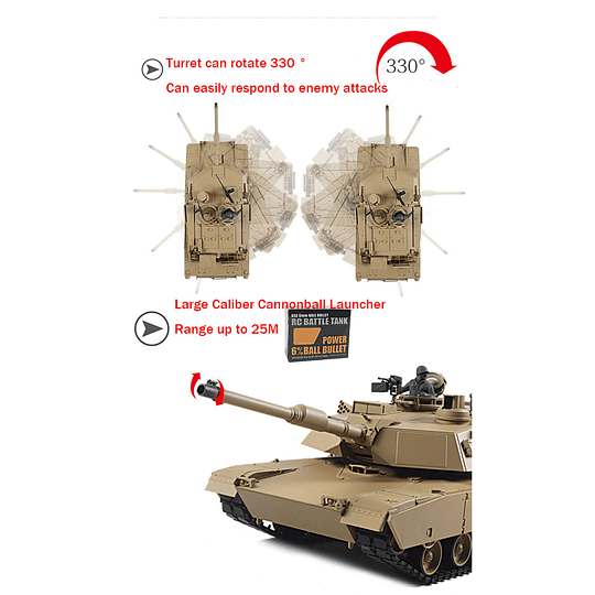Funciones: Giro izquierda/derecha, delante/atrás, giro de torreta 330° , cañón sube y baja 30°, orugas para diferentes tipos de caminos (tierra, pasto, piedras), luz y sonido